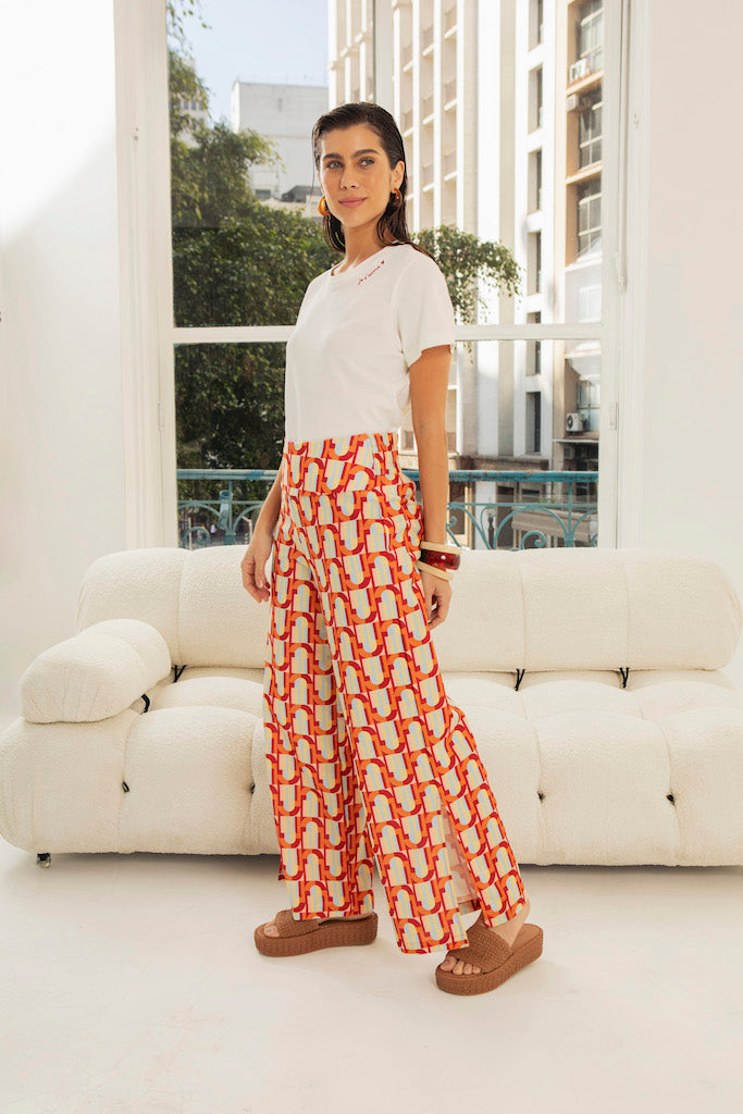 A Calça Soleil foi desenvolvida em estampa exclusiva Alaphia, que imprime originalidade e impacto visual à peça. Com modelagem de cintura alta, apresenta detalhe de sobreposicão na parte frontal da pala, que confere um acabamento sofisticado. O shape amplo garante fluidez nos movimentos, resultando em um visual descomplicado e elegante.