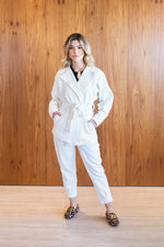 A calça Vera, confeccionada em malha texturizada, possui modelagem de cintura alta ajustada por elástico; caimento ajustado ao corpo e detalhe de prega na barra.  Este modelo apresenta bolsos sobrepostos na parte da frente e na parte de trás.