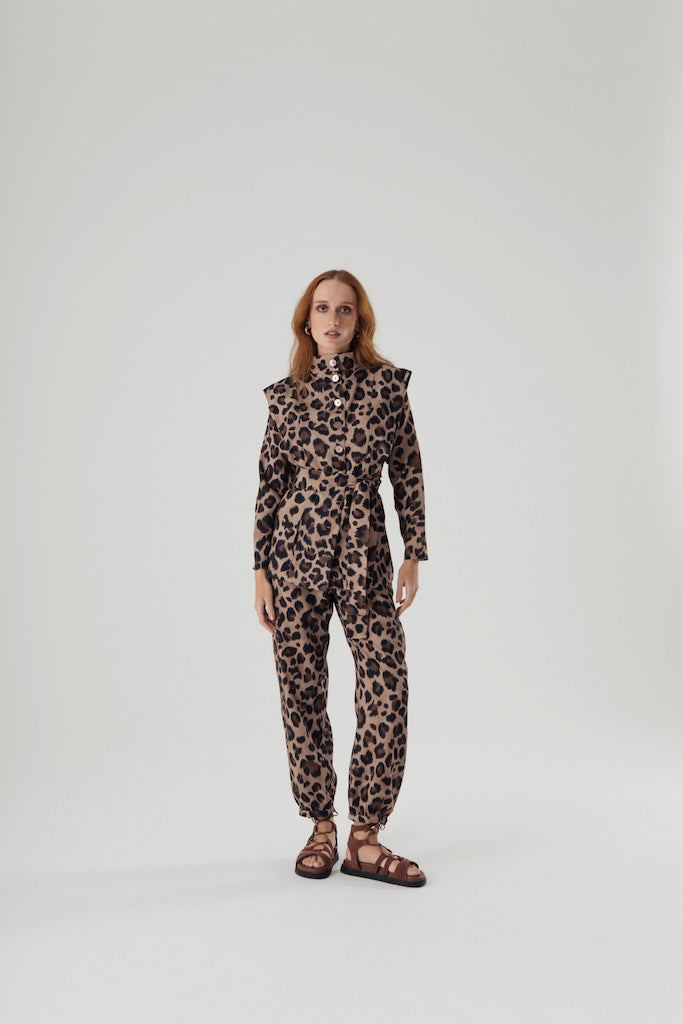 A calça Wild possui design moderno, com estampa de leopardo desenvolvida exclusivamente por nós. Modelagem de cintura alta com fechamento por zíper invisível, bolsos frontais e barra afunilada.