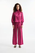 A camisa Luisa, confeccionada em cetim com estampa "Pied de Poule" possui modelagem de gola alta e mangas compridas, bufantes. Detalhes franzidos na gola e nos punhos. Fechamento por zíper invisível na parte posterior da gola e nas laterais dos punhos.