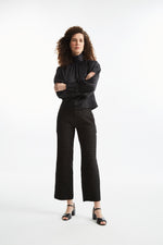 A camisa Luisa, confeccionada em cetim com estampa "Pied de Poule" possui modelagem de gola alta e mangas compridas, bufantes. Detalhes franzidos na gola e nos punhos. Fechamento por zíper invisível na parte posterior da gola e nas laterais dos punhos.