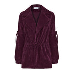 Confeccionada em veludo, a Jaqueta Alessia traz textura marcante e visual sofisticado. As mangas balão ganham regulagem por puxadores com cordão no mesmo tecido, permitindo ajuste personalizado e efeito volumoso. O revel na gola e na vista completa o design com acabamento elegante. Uma peça de destaque para composições contemporâneas.