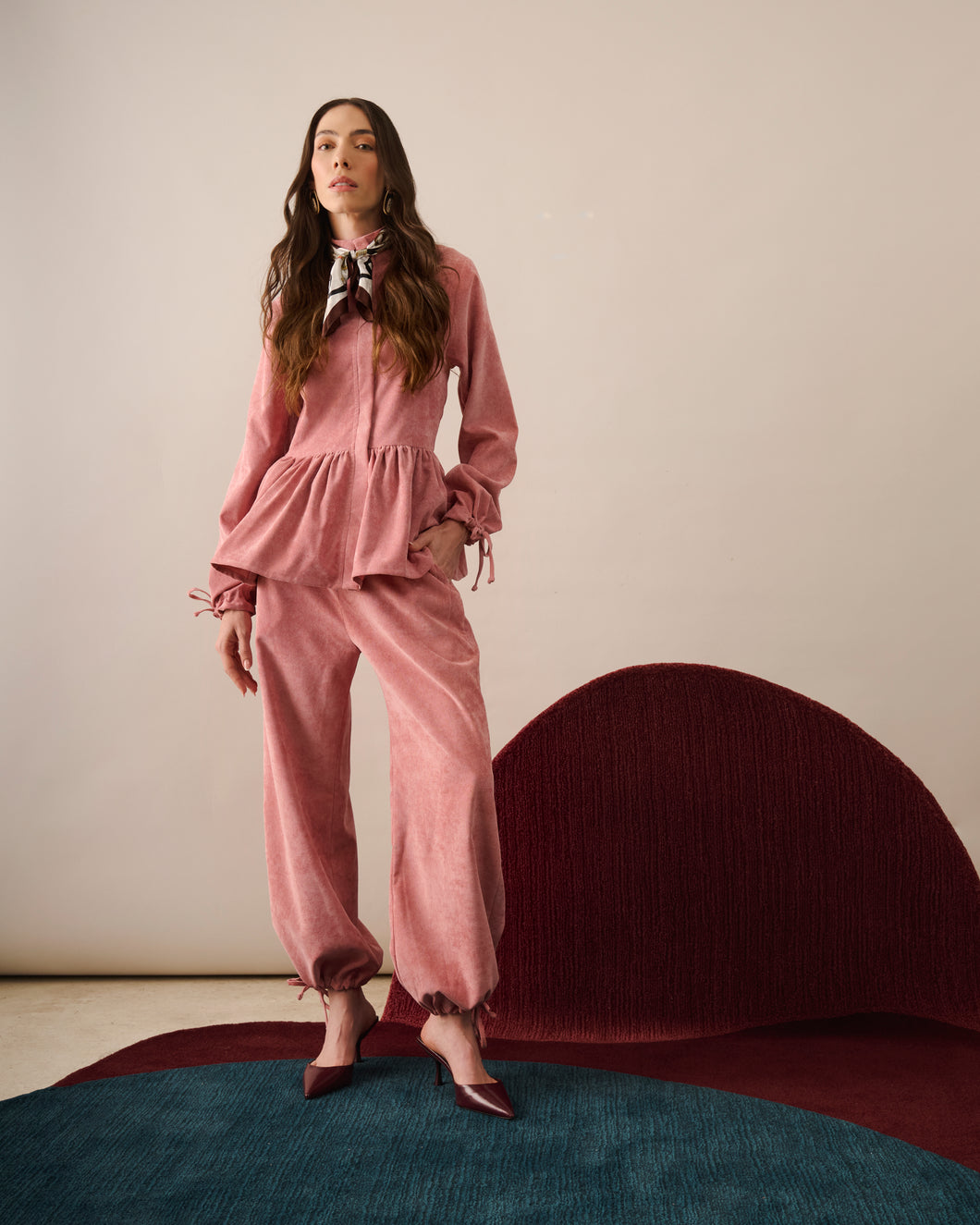 Confeccionada em veludo, a Jaqueta Manuela possui modelagem ampla com peplum, criando contraste entre a parte superior mais estruturada e o volume na barra. O recorte na cintura dá origem ao babado, que adiciona movimento e valoriza a silhueta sem comprometer o conforto.