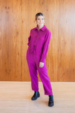 O Macacão Giovana, confeccionado em viscose, possui mangas longas com punhos fechados por botões, gola v com vista com fechamento por botões na parte da frente, cordão interno para ajuste na cintura e bolsos laterais. Esse modelo possui recortes com detalhes pespontados nas pernas, bolsos nas laterais e na parte posterior e barra italiana.