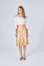 A saia Esther, confeccionada em couro ecológico, apresenta modelagem godê, cintura alta, comprimento midi e recortes com detalhes prespontados. Fechamento posterior por ziper invisível.