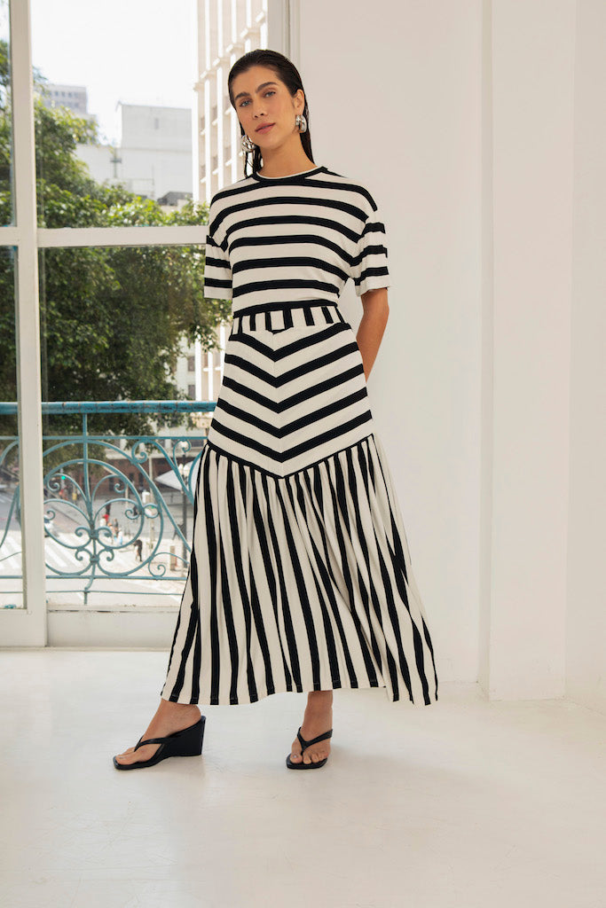 O cós de elástico estruturado valoriza a cintura, enquanto a disposição das listras em diferentes direções — horizontais, diagonais e verticais — traz dinamismo e alonga a silhueta. O comprimento longo reforça a proposta contemporânea.