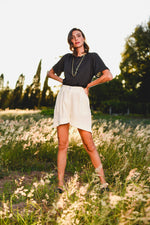 O Shorts Beatriz, confeccionado em crepe, possui modelagem assimétrica e fechamento frontal por ziper e botão de madre pérola.