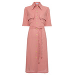 O vestido Joana, confeccionado em linho, possui mangas curtas, bolsos assimétricos na altura do busto, fechamento frontal por botões de madeira e bolsos embutidos nas laterais. Esse modelo tem caimento reto, cintura com passantes e faixa ajustável.