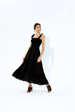 O Vestido Lola, possui decote quadrado, alças médias com detalhe em laço e lastex aplicado na parte frontal e posterior do busto. Aplicação de babados na saia com detalhes franzidos, caimento reto e comprimento longo. Confeccionado em crepe.